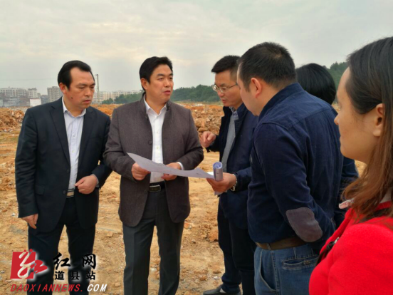 湖南省道县县委副书记、县长李天明(左二)在城区学校项目建设现场与相关人员研究学校建设有关情况。
