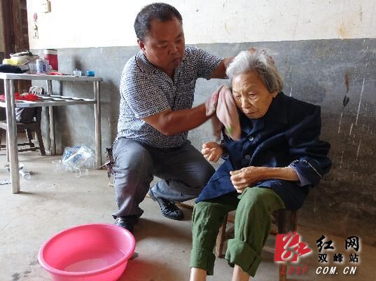 杨展培服侍老人洗漱。