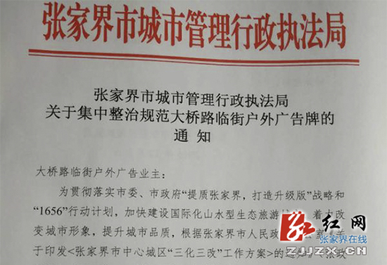 红网张家界分站12月8日讯(分站记者 李森林 通讯员 李晓华)12月8日,记者从张家界市城市管理行政执法局获悉,即日起该局将对市中心城区大桥路(南庄坪大市场至市政协路段)临街户外广告牌进行集中规范,单位或商户可在12月21日上午8时前自行对照整改拆除,逾期未整改到位的,市城管局将依法进行强制拆除。