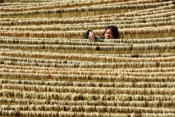 村民正在翻晒红薯粉丝。
