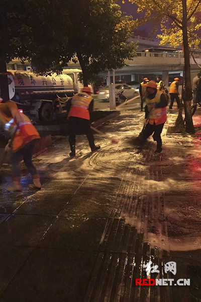 长沙市芙蓉区环卫、渣土办工作人员正在对辖区内主要道路进行深度清洗。