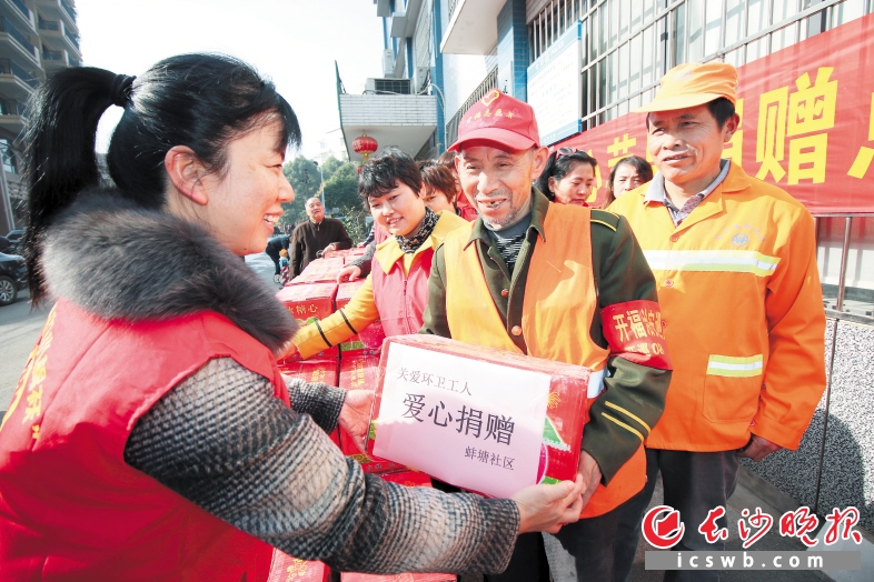 时刻新闻 —分享— 昨日,开福区东风路街道蚌塘社区党委“关爱保洁员,寒冬送温暖”活动开展,志愿者认购安徽砀山贫困果农600多件苹果,慰问清扫员等外来务工人员。 长沙晚报记者 周和平 摄 来源:长沙晚报 作者:周和平 编辑:康晓乔