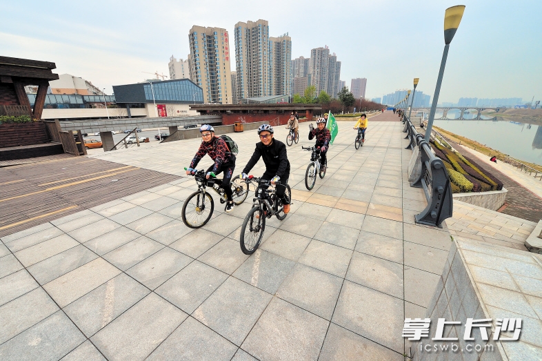 ↑日前,一群自行车爱好者在浏阳河风光带惬意骑行。