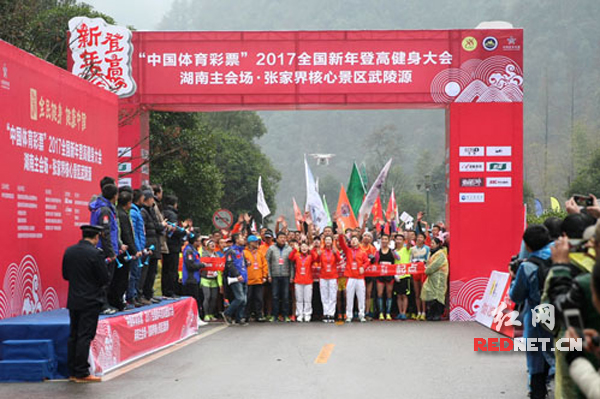 红网张家界12月25日讯(时刻新闻记者 陈宗昊)24日,2017年全国新年登高湖南主会场活动在张家界黄石寨景区举行,来自湖南、湖北、江西、广东等多个省市的2000多名户外运动爱好者齐聚张家界,用最积极健康的方式迎接新年到来。举重奥运冠军王明娟,蹦床世界冠军罗丹、陶毅到主会场为选手加油鼓劲。