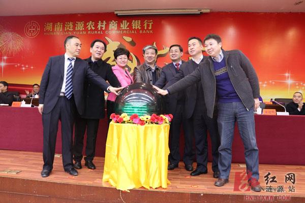 湖南省农村信用社联合社党委委员、纪委书记余开生(左四),娄底市委常委、副市长陈蕾(右三),娄底银监分局局长胡润生(左二),人民银行娄底中心支行副行长李泽军(右一),涟源市委书记谢学龙(左三),市委副书记、市长宋建明(右二),涟源农商银行董事长黄益民(左一)共同开启涟源农商行开业水晶球。