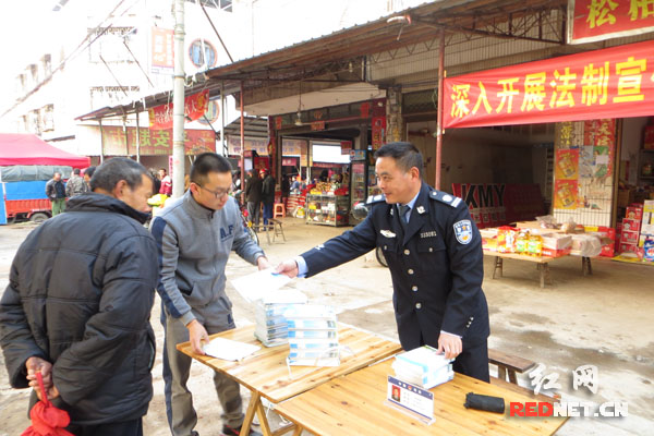祁阳县司法局文富市司法所所长李良钢(右一)给老百姓发放法律宣传手册。
