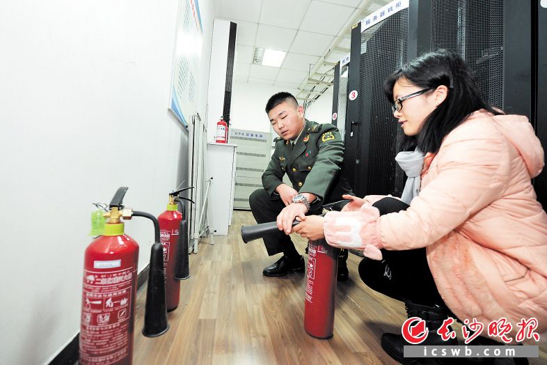在岳麓区火炬城社区的长沙宏地科技开发有限公司,消防官兵教公司员工使用灭火器。 长沙晚报记者 王志伟 摄