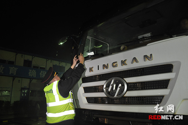 30日晚,在岳麓区大学城市片保障性住房项目经理部施工地,城管执法人员正在对即将出场的渣土车进行检查。