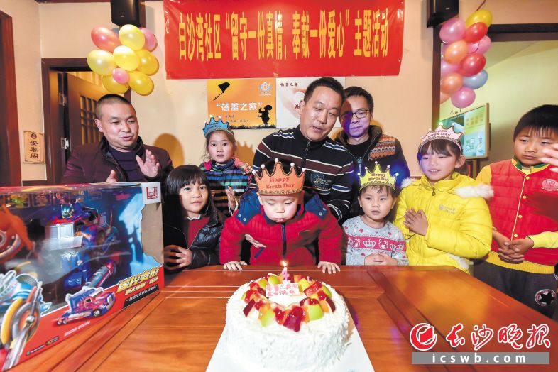 水果摆出“Happy birthday”拼盘,大蛋糕由居民亲手制作,每位参加集体生日的孩子都有一户结对爱心家庭。“你有多久没见过爸爸妈妈了?”5岁的杨梓默歪着头想了许久:“记不清了。”梓默的父母在广州做生意,跟随奶奶生活的他最大的生日心愿就是能有一个变形金刚。“叔叔给你一个惊喜!”与其结对的“品也”茶餐汇总经理钟泽高,悄悄走出活动现场,待其返回时,一个大大的变形金刚呈现在梓默面前,搂着爱心叔叔的脖子,小家伙开心得不愿撒手。