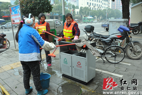 红网安仁县分站1月11日讯(通讯员 何超)连日来,湖南省安仁县天气温度骤降,寒风卷着小雨,冻得人们都穿上了厚厚的衣服。然而,在安仁县七一路上,都活跃着一支坚守岗位的环卫工人。他们手拿着拖把、抹布,把护栏和垃圾箱擦洗得干干净净,用不怕严寒、敬业奉献的实际行动,为新年增添美丽。