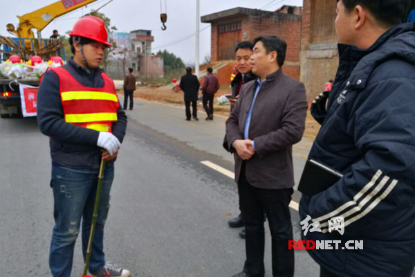 1月20日,道县县委副书记、县长李天明(右二)在道县高速公路连接线现场了解路灯安装情况。