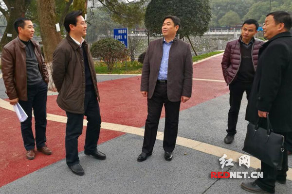 1月20日,道县县委副书记、县长李天明(左三)在西洲公园提质改造工程现场检查工程建设质量。