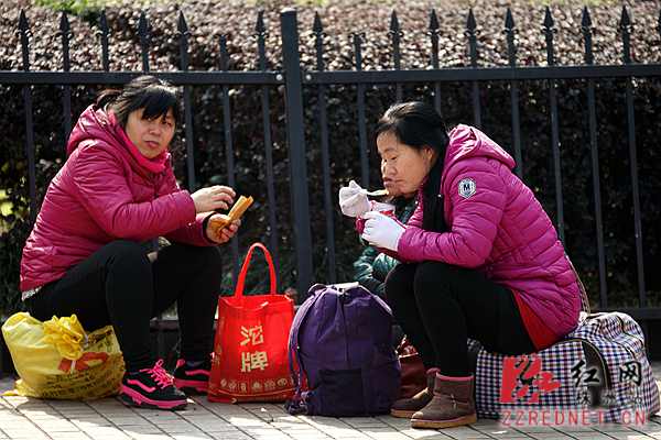 上午11时,来自河南商丘的甄美华和两个同乡坐在火车站前坪的花坛旁,喝着八宝粥。这是她今天第一次也将是最后一次进食。“火车站附近的盒饭太贵了,火车上的饭菜也不便宜,喝点粥垫垫,明天到家后再多吃点,省下的钱可以给家里多买2斤肉。” 甄美华告诉记者,自己和工友是第一次来株洲市,怕找不着路误了火车(甄美华乘坐的火车进入株洲站的时间为下午4:42,到达商丘为次日早上8:29),于是上午10时左右就到了株洲火车站。她由于到站时间过早,进不了候车大厅,又不舍得花钱去旅馆休息,只得选择在火车站前坪候车。