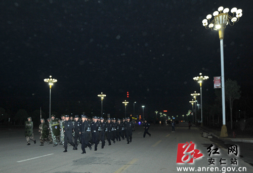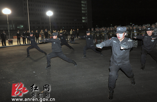 来自安仁县公安、消防、武警、县法院、县检察院、县司法局、县民兵应急分队和县委办、县应急办、县人民医院共570余人迅速进入各自的战斗岗位,乘着夜色,展开了擒敌拳、格斗、战术队形、防火消防和危爆物品搜索等科目。