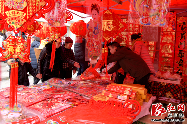 红网麻阳县分站1月23日讯(通讯员 滕晖)1月21日,记者在湖南省麻阳县城看到,随着春节的临近,春联、挂图、糖果、肉类等各种年货均销售火爆。市民们采购年货欢度春节,犒劳辛勤忙碌了一年的自己和家人,喜迎朝气蓬勃的2017年。