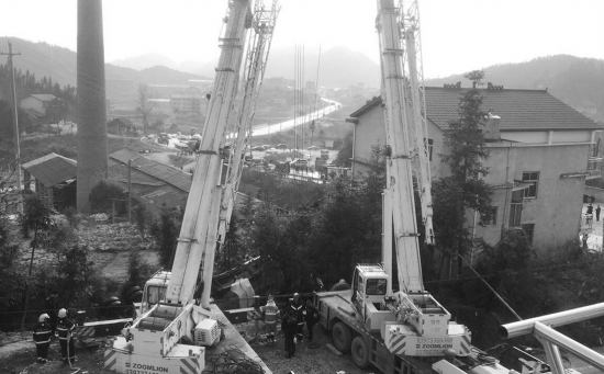 1月23日,消防正在油罐车侧翻现场紧急排 险。图/通讯员龚荔