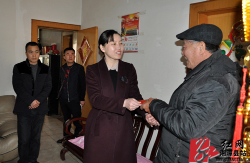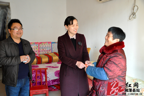 当天,周艳希一行首先来到易俗河镇凤形山社区尤太祥家里,详细询问了尤太祥生活中存在的困难和问题。尤太祥与妻子朱惠君是失独家庭,年龄都在70左右,妻子因交通意外受伤,有一孙女正在上学。了解情况后,周艳希勉励他们勇敢面对生活,保持坚强乐观的态度,并送上了新年的问候和慰问金。