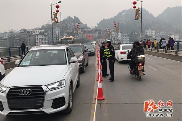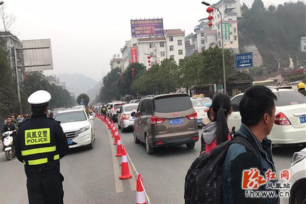 从1月28日下午14时开始,凤凰城区各路段、路口,绕城线等地车流量迅速增大,为了避免交通拥堵,凤凰县公安局交通管理大队投入全部警力,采取定点执勤与引导分流相结合的方式控制车流,设置固定执勤点、临时检查点、引导分流点、交通安全劝导服务站共30个,全力为古城旅游交通保驾护航。