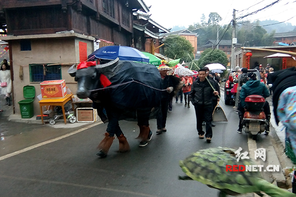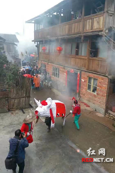 红网通道2月3日讯(通讯员 吴孟霞 李尚引)2月3日,大年初七,2017农历鸡年的第一个节气“立春”。湖南省通道侗族自治县皇都侗寨的侗族群众敲锣打鼓,赶着“春牛”走村入户,举行“闹春牛”活动,祈求来年风调雨顺、五谷丰登。