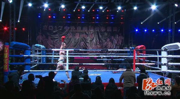 红网凤凰县分站2月5日讯(分站记者 龙磐 通讯员 肖昕翔)2月4日,中国凤凰苗疆风云·2017中外自由搏击拳王争霸赛在凤凰县禾库镇举行,整场比赛精彩刺激,吸引了上万名当地市民及八方游客前来观看,现场气氛极其活跃。