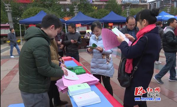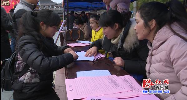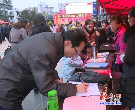 红网绥宁县分站2月8日讯(通讯员 龙宪智 唐滇滇)2月5日,由湖南省绥宁县人社局、县扶贫办、县总工会、县妇联联合举办的2017年“就业精准扶贫暨春风行动”招聘会在县绿洲广场举行。招聘现场人头攒动,一片火热,吸引了全县上万名贫困村农民朋友和就业困难人员前来应聘求职。河口苗族乡竹舟江村的龙先生高兴地说:“今天,我与绿森林大药房签订了仓管用工合同,每月工资2500元左右,既能保证自己有一份工作,又能照顾老人与小孩子,挺好的。”