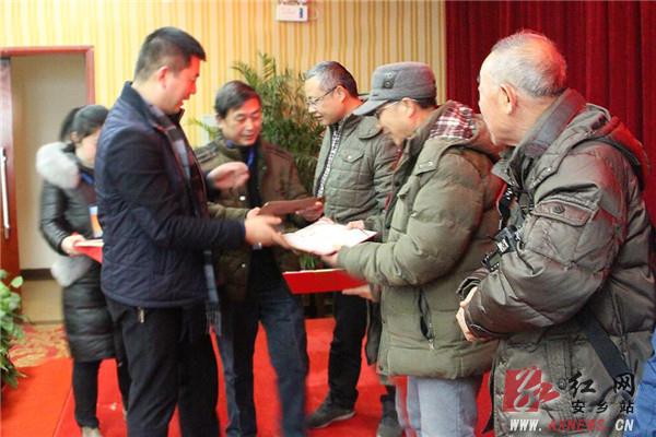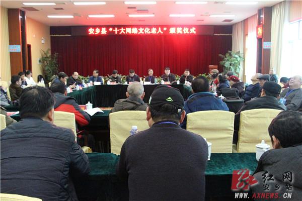 红网安乡县分站2月8日讯(分站记者 杨慧)为弘扬网络正能量,积极引导网民关注、支持全县经济社会发展,2月7日,安乡县首届“十大网络文化老人”颁奖仪式在长鹰酒店大会议室举行。市政协原副主席、新华网十大名博博主张新民,市史志办原主任应国斌,县委常委、县委宣传部部长吉海波,县老年网络协会主席李承武,县诗词协会主席齐跃生,县委宣传部、县交通局、老干局、电子政务办、县摄影家协会、县作家协会等各相关单位负责人,部分媒体和自媒体代表,各行各业网友代表参加颁奖仪式。