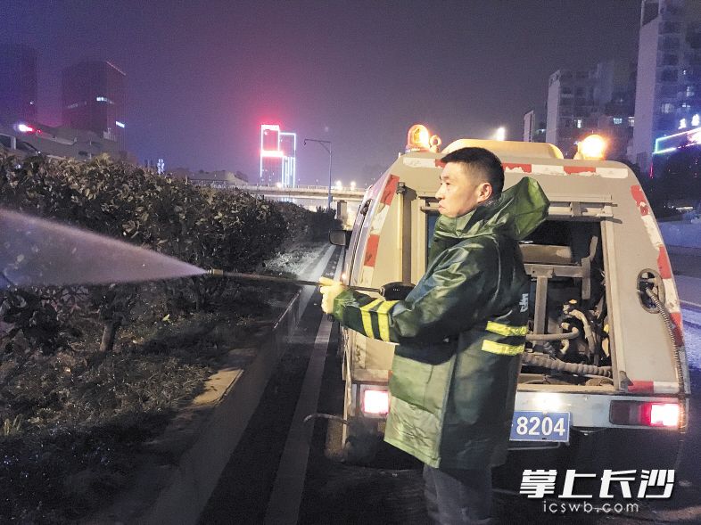 昨日凌晨,冒着严寒细雨,黄清明正在认真清洗绿化带。长沙晚报记者 王斌 摄