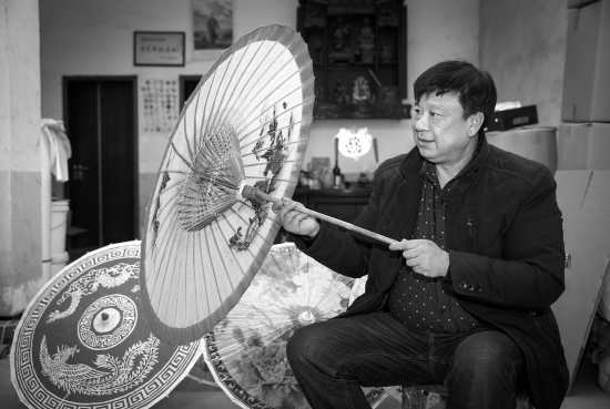 2月6日,湘潭县石鼓镇,赵文超介绍当地做油纸伞的历史。图/记者陈正