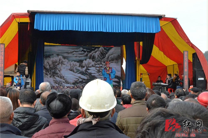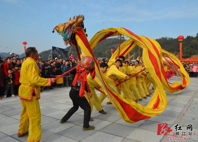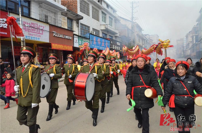下午2时30分开始,舞龙队伍、腰鼓队、军鼓队便从桃花新城出发沿着武潭镇区巡游,吸引沿线群众热情参与,伴随着沿街两侧的鞭炮声,十分热闹;与此同时,桃花新城搭建的舞台上,歌舞表演、大型戏曲《富寿图》也已开演,演员们娴熟精湛的演技、传统的花鼓戏唱腔,引得现场观众连连叫好。