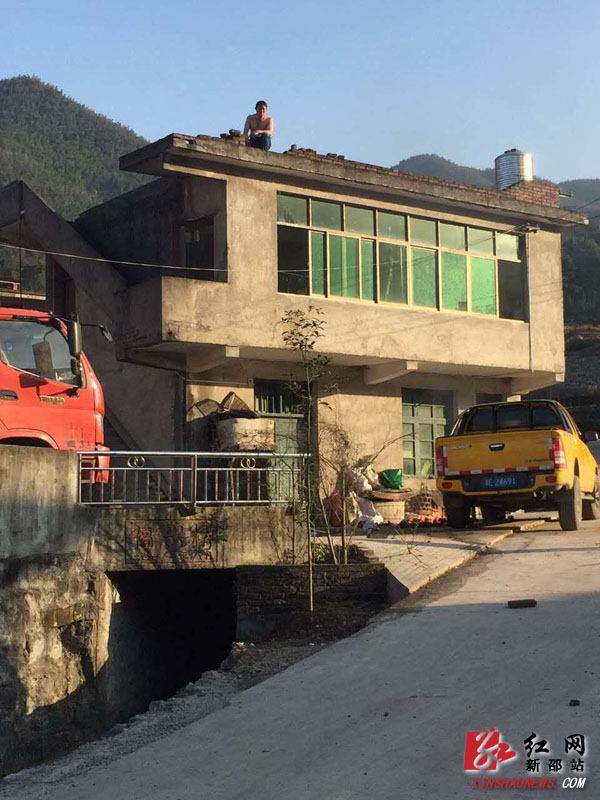 黄某坐在屋顶上