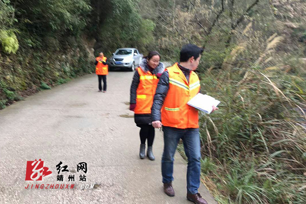 红网靖州县分站2月28日讯(通讯员 王秋秋)2月27日,湖南省靖州县公路局三个身穿红色反光背心公路标志服的工作人员在乡道X171线用手机对裂缝照相、用钢卷尺丈量裂缝长度。这是该局在对全县辖区内的所有县、乡、村道约920余公里农村公路进行病害和安全隐患路况调查。此次调查需工作人员采用步行方式逐点逐线进行,点多、线长、面广、任务量大。
