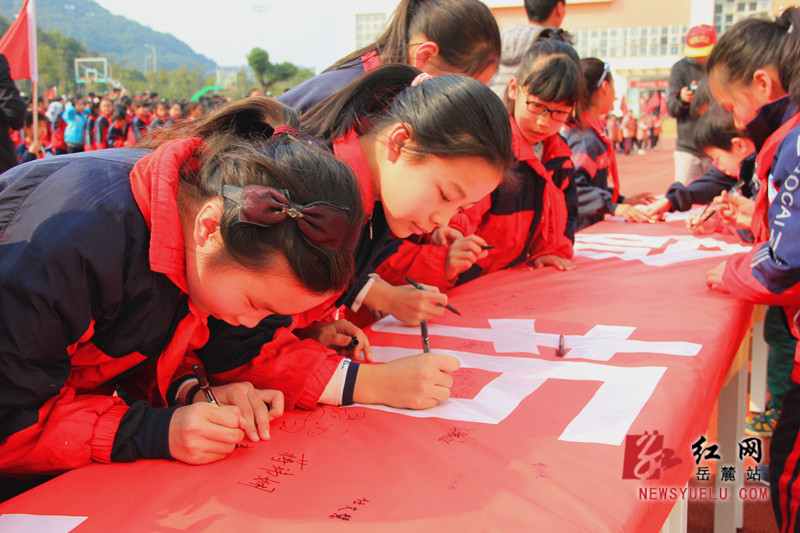 学生们在宣传横幅上签名,表达对毒品的抵制