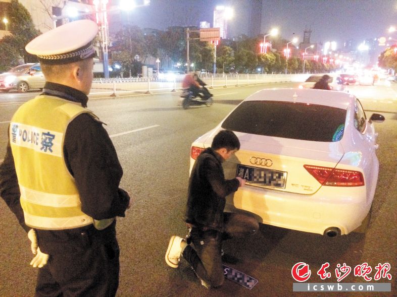 昨晚,长沙设30个集中整治点(其中10个为多警种联合整治点),针对夜间多发交通违法、涉牌涉证、酒驾毒驾等严重交通违法行为进行突击整治。一辆未悬挂机动车号牌的小车被开福区交警大队四中队民警周玉凌拦下,该车的临时号牌已过期,一副崭新的车号牌却放在后备厢,“机动车不依法安装和悬挂号牌,将面临罚款、记12分的严厉处罚。”民警找来螺丝刀,责令该车驾驶员将车牌按规定安装好。 长沙晚报记者 小刘军 摄