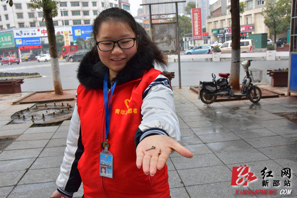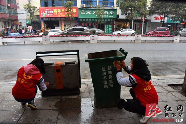 当天,新邵一中58位“小红帽”在团支书记石小毛的带领下走上街道,开展爱护环境的志愿服务活动。当他们看到清洁工人正在忙着清扫,“小红帽”立刻行动起来与环卫工人一起清扫街道。在菜市场,看到废弃的蔬菜叶、烟头。“小红帽”们毫无顾忌用手捡起这些垃圾。看到脏糊糊的垃圾桶,小红帽们马上用毛巾进行清洗。正在卖菜的一位女士感叹:“这些学生娃子真不错,不怕脏,好勤快。”
