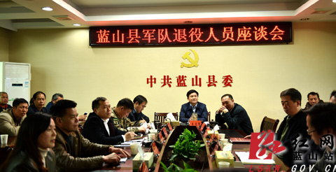 红网蓝山县分站3月6日讯(分站记者 李先志)3月3日,为进一步开门纳言,广听民意,湖南省蓝山县委书记秦志军主持召开了蓝山县军队退役人员座谈会。县领导李劲涛、黄和平、聂朝飞、黄萍、郭晓武、李勇,县纪委、政法、公安、民政、人社、信访等部门负责人,以及来自全县30多名分别代表蓝山籍铁道兵、79届、81届、82届、85届的退役老兵参加。