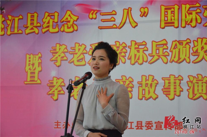 在桃江县纪念“三八”国际劳动妇女节暨孝老爱亲标兵颁奖仪式、孝老爱亲故事演讲赛上,从2月22日孝老爱亲故事演讲赛初赛中脱颖而出的10名选手在台上讲述了一桩桩、一件件发生在桃江县20位孝老爱亲标兵身上的感人事迹。一个个感人肺腑的故事、一段段发自内心的深情表白,感染了现场的每一位观众,赢得了阵阵掌声。
