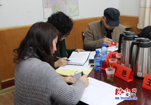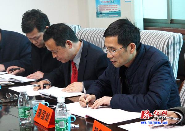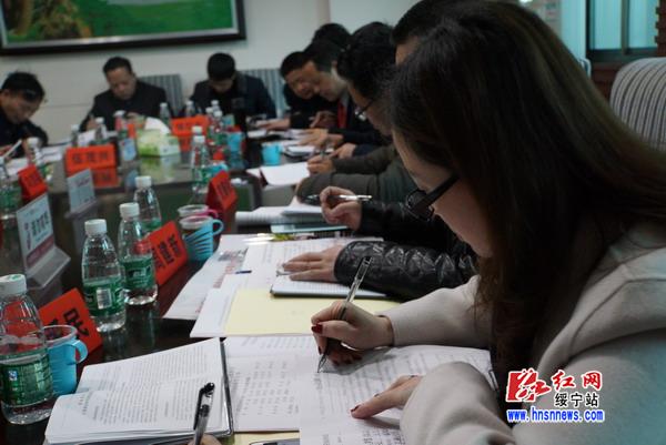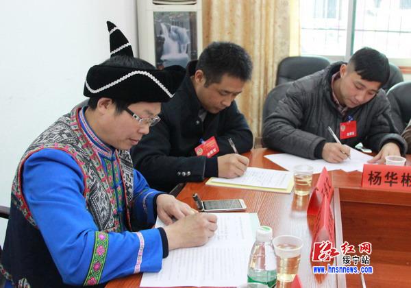 绥宁县政协主席唐国瑚(右一)正在认真答题