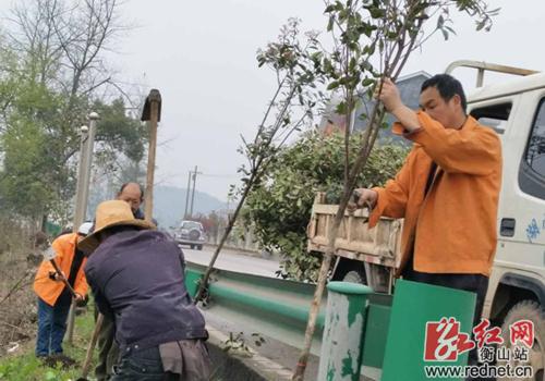据介绍,107国道衡山段两侧行道树原来主要种植了意大利杨树,树龄超过20年,该树成长快但易长虫,被大风刮倒现象时有发生,存在安全隐患。去年衡山县公路局对该路段枯死的杨树进行了砍伐,今年趁着好时节对107国道以及314省道、新马线等干线公路两侧行道树进行补栽补种,截至目前,已补栽樟树、红叶石楠等树种5000余棵,为全面完成全年公路绿化任务打下了坚实基础。
