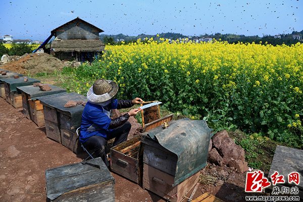 麻阳县锦和镇长潭村,一名蜂农正在油菜花田边采蜜。摄影:滕解信