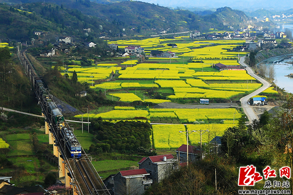 麻阳县锦和镇官庄村,火车正在油菜花田边的铁路上行驶。摄影:滕解信