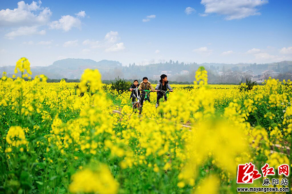 麻阳县兰里镇锦江村千亩洲,孩童踏车游玩在油菜花田边路上。摄影:陈铁牛