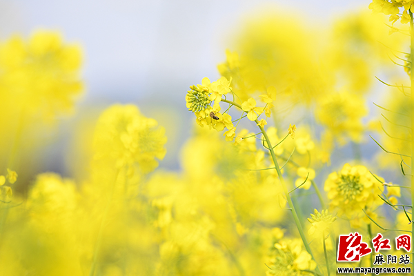 麻阳县兰里镇锦江村千亩洲,一只蜜蜂在油菜花上采蜜。摄影:张祥雄