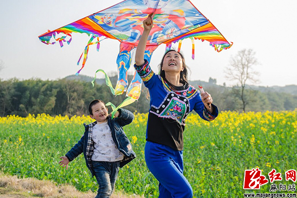 麻阳县兰里镇锦江村千亩洲,在油菜花田边放风筝。摄影:陈铁牛