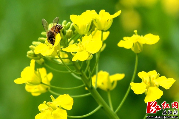 麻阳县乡村,一只蜜蜂在油菜花上采蜜。摄影:滕建甲