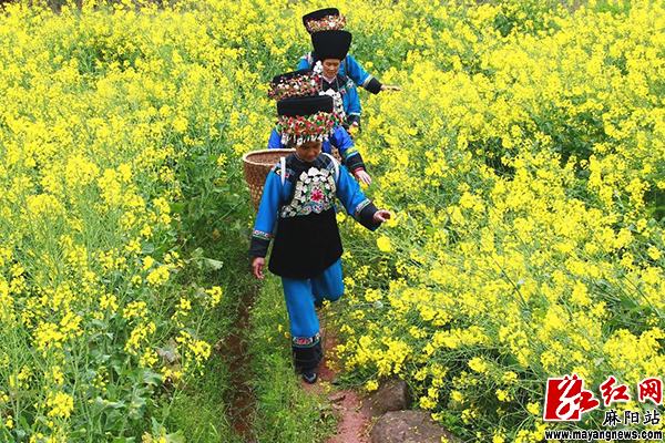 麻阳县石羊哨乡峦潭村,身穿苗服的妇女从油菜花田里走过。摄影:滕解信