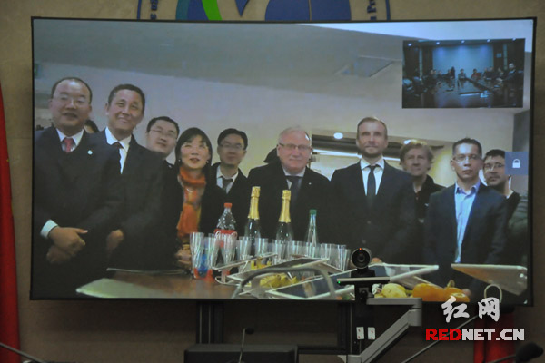 此次捐赠的远程会议视频系统由上海航空电器有限公司提供。蒙达尔纪市副市长考克兰、上海航空电器董事长蒲毅、蒙达尔纪纪念馆馆长王培文等在法国蒙达尔纪市与湖南省外事侨务办现场开展视频对话。