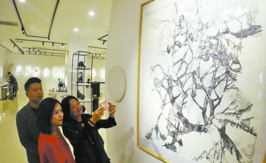 3月22日,为期10天的《融合的宁静——树石恋胡蓉个人作品展》在长沙禾马艺术馆举行,展出我省年轻艺术家胡蓉近50幅钢笔纸本画、铜版和锌版蚀刻版画,作品均以树和石头为素材。展览免费对市民开放。湖南日报记者 徐行 摄