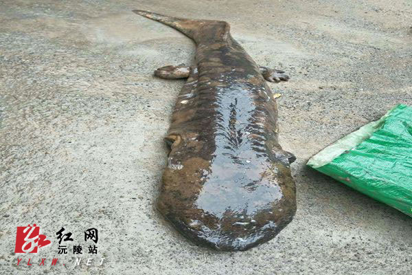 红网沅陵县分站3月24日讯(分站记者 李青松 通讯员 谢吉健)近日,湖南省沅陵县大合坪乡林业站工作人员在大合坪乡白香湾水电站内发现一条野生娃娃鱼,这条娃娃鱼体长1.2米,重量超过15公斤,呈棕黑色,颜色比较深,身上外表有颗粒,这也是沅陵县迄今发现最大的一条野生娃娃鱼。