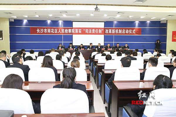 红网长沙4月1日讯(时刻新闻记者 郑涛)4月1日,长沙市雨花区人民检察院举行落实“司法责任制”改革新机制启动仪式。湖南省检察院党组副书记、副检察长卢乐云,长沙市人民检察院党组书记、检察长王勋爵,雨花区委书记张敏出席仪式并讲话。