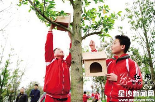 3月31日上午,长沙市第36届爱鸟周活动在松雅湖国家湿地公园举行。图为百熙实验小学的学生将爱心鸟巢悬挂在树上。 章帝 摄